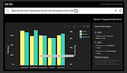 - Zia can search through customer records in your CRM and pull up information that you need instantly. She can take notes while you talk to a prospect, build reports and dashboards upon request, and monitor and notify you of sales anomalies.