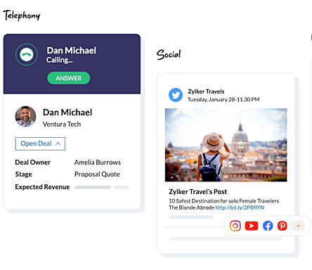 - While interacting with a customer on social media, you can instantly view the interactions they've had with your sales and service teams, such as ticket ID, deal history, and more.